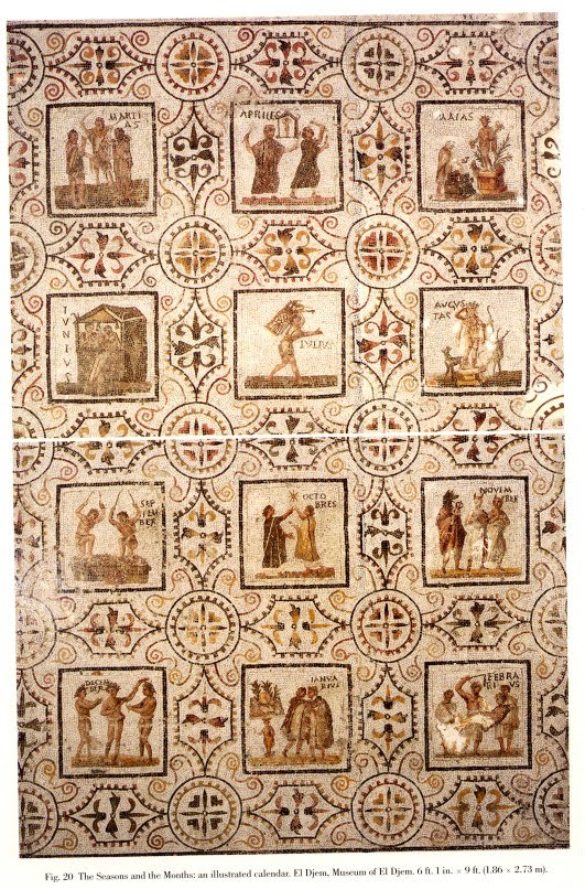Di questi usi, abbiamo una straordinaria rappresentazione nel celeberrimo mosaico di El Djem, che costituisce uno degli esempi più interessante di calendario illustrato.