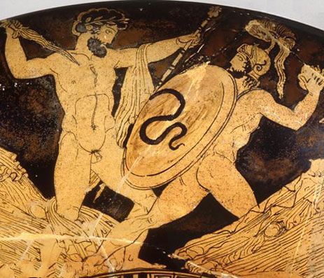Zeus combatte il Gigante Porphyrion. Kylix attica a f.r., V a.C. Antikensammlung, Berlino.