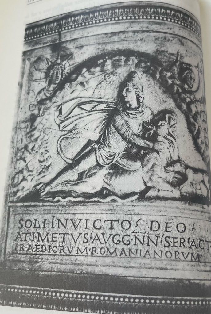 “SOLI INVICTO DEO/ ATIMETUS AUG(ustorum) N(ostrorum) SER(vus) ACT(uarius)/ PRAEDIORUM ROMANIANORUM”