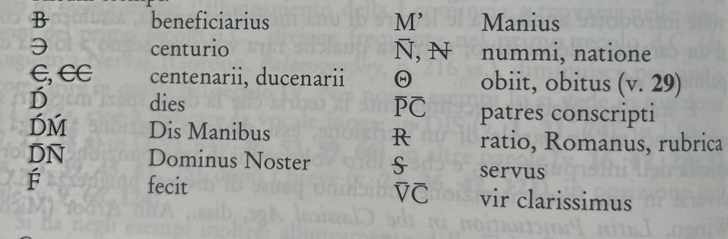 Come si diceva, però, la lettura di queste iscrizioni non è immediata, neppure per chi si è trovato a studiare latino, ad esempio, alle scuole superiori e questo perché esiste una sorta di “codice” che dev’essere conosciuto per svolgere correttamente l’epigrafe e, prima ancora di tradurla, provare ad esempio a riportarla correttamente su un foglio.[3]