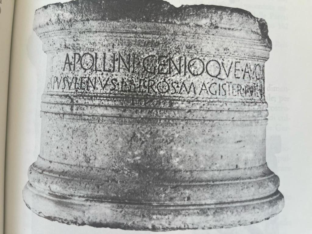 Al Genius Augusti e ad Apollo sono dedicate alcune offerte che qui sono enumerate: il “puteus” innanzitutto, cioè il pozzo su cui si trova l’iscrizione, poi abbiamo la vera del pozzo “puteal”, piante Lauro “laurus”. La parola “magister” è invece riferita al dedicante.